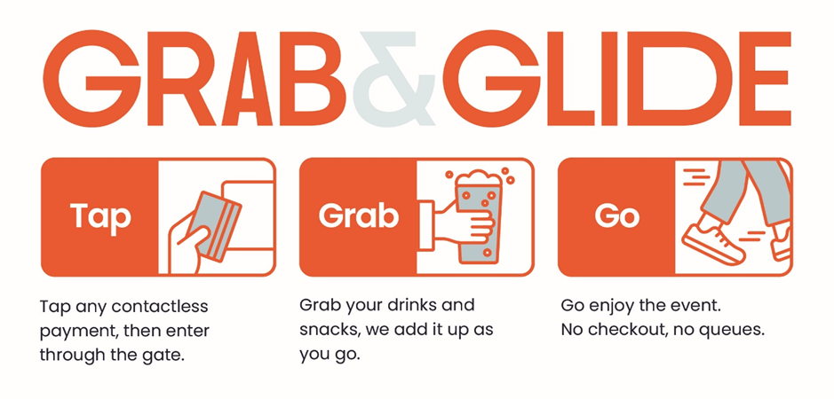 As part of our ongoing investment in enhancing your customer experience, we’ve partnered with Amazon to launch our new Grab & Glide bar to make getting food and drinks quicker and easier than ever. With an average purchase time of just seven seconds, no tills, and no queues, it’s a simple tap, grab, and glide. That means less time waiting and more time enjoying the event atmosphere.